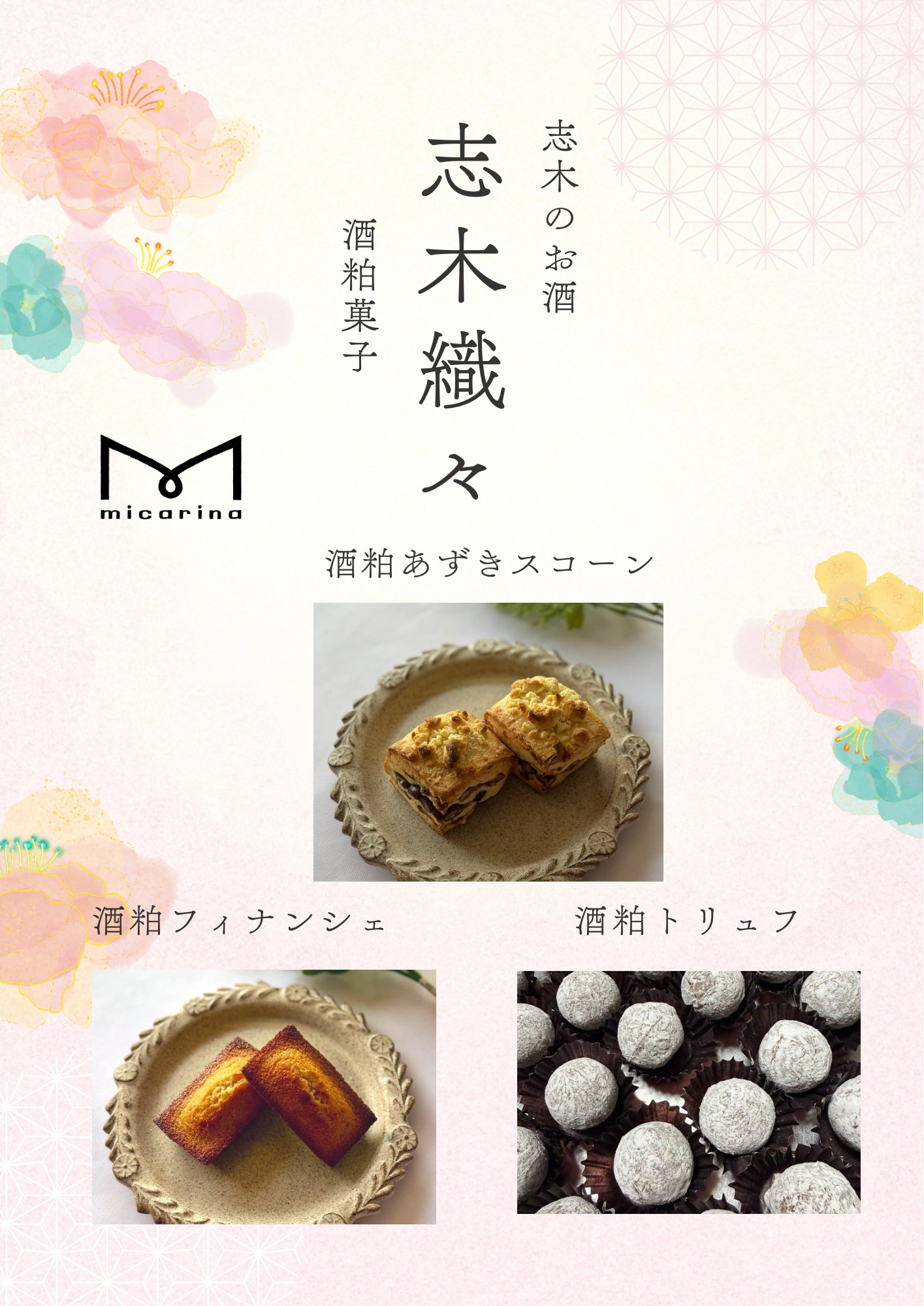 志木市の日本酒「志木織々」の酒粕を使ったお菓子を中心に、micarinaの焼き菓子が並ぶ予定です。